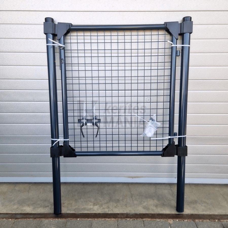 Antracit egyszárnyú kertkapu 100x100 cm méretben, ponthegesztett hálós betéttel. Horganyzott és porfestett acél kapu, két 60 mm-es oszloppal. Hátsó kertbe, kiskerthez, kennelhez ideális, kb. 90 cm szabadnyílással.