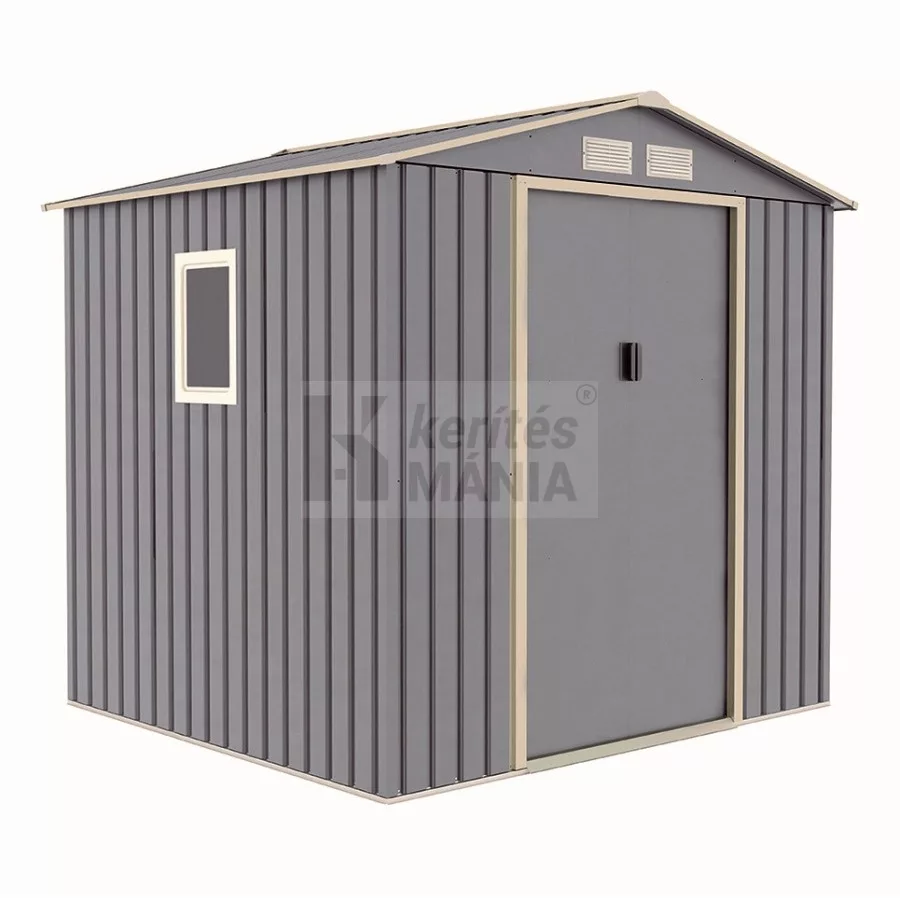 A Menorca szürke kerti fém tároló ház 214 x 204,5 x 194 cm méretben zárható, időjárásálló és stílusos tárolómegoldás.