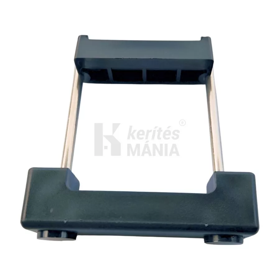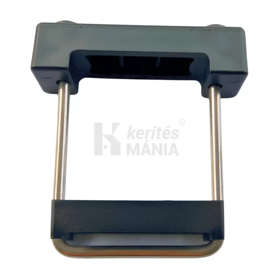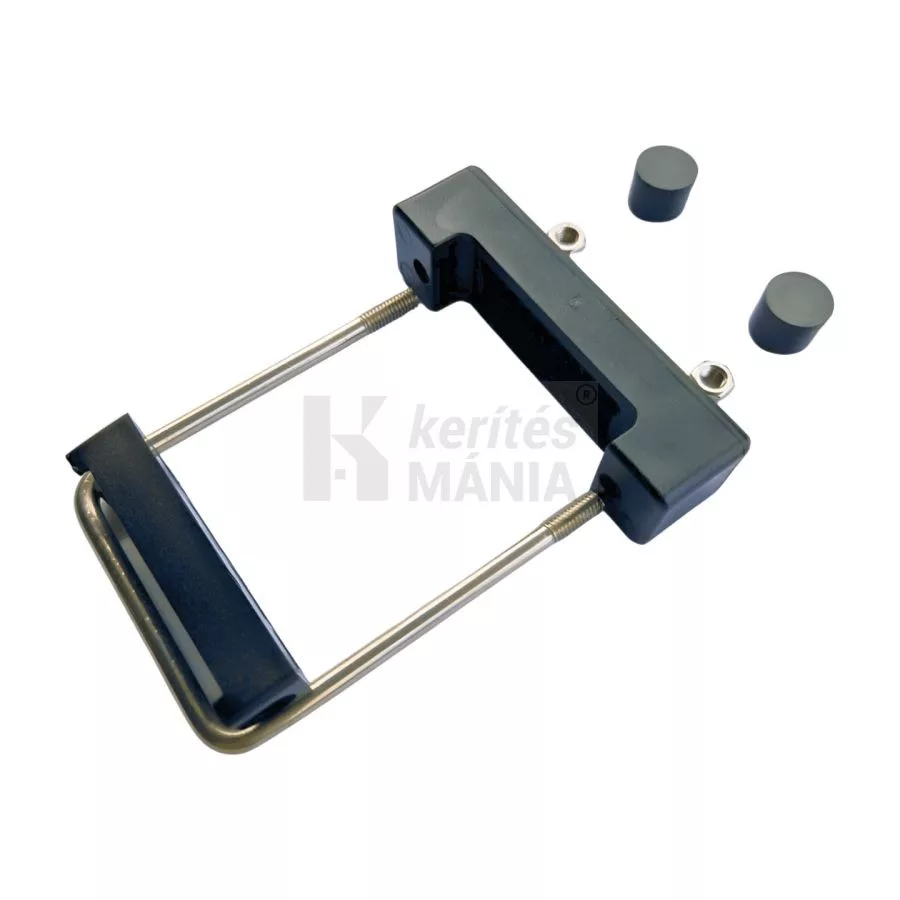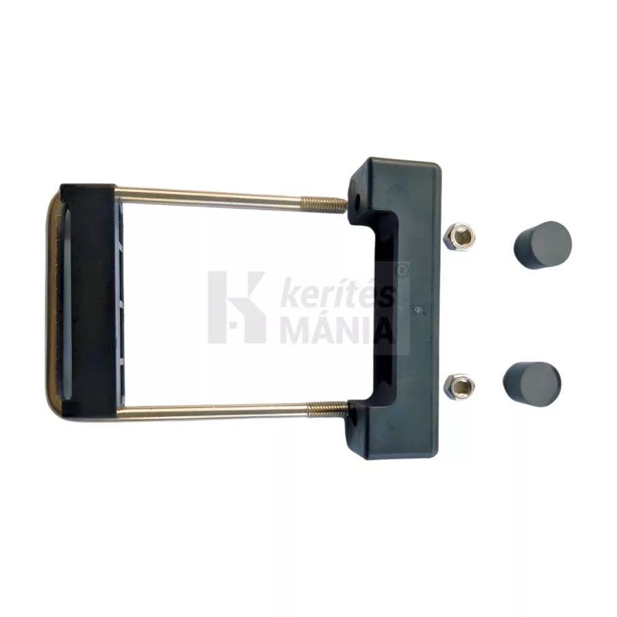 Rozsdamentes rögzítő bilincs 60x60 mm-es négyzetes oszlophoz. U alakban hajlított rozsdamentes acél menetes véggel. Fekete táblarögzítő kengyel, amely a kerítéspanelt az oszlop előtt fogja át. Biztonságos, roncsolás nélkül nem bontható.