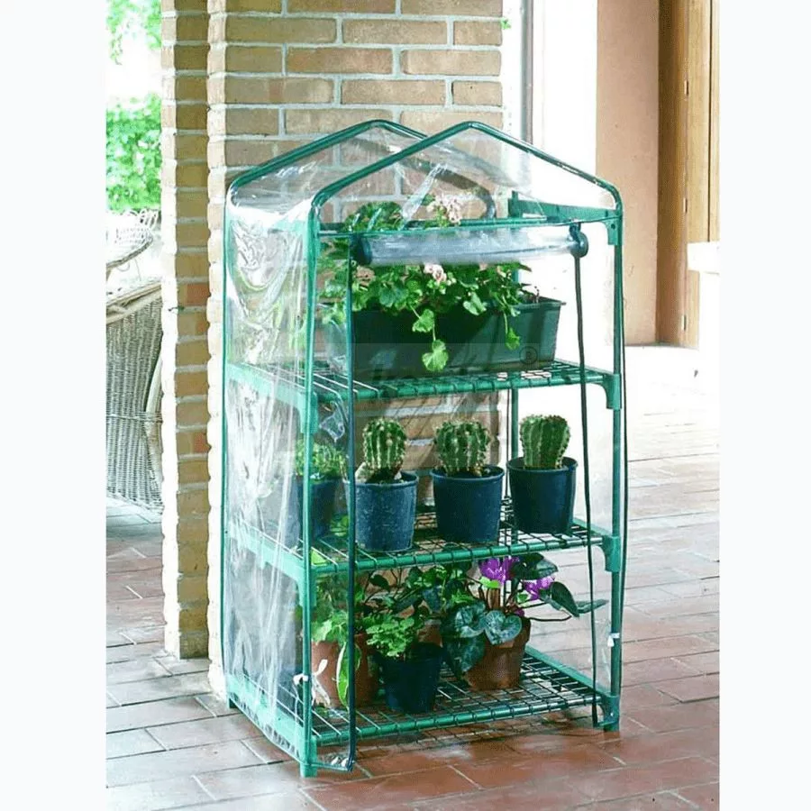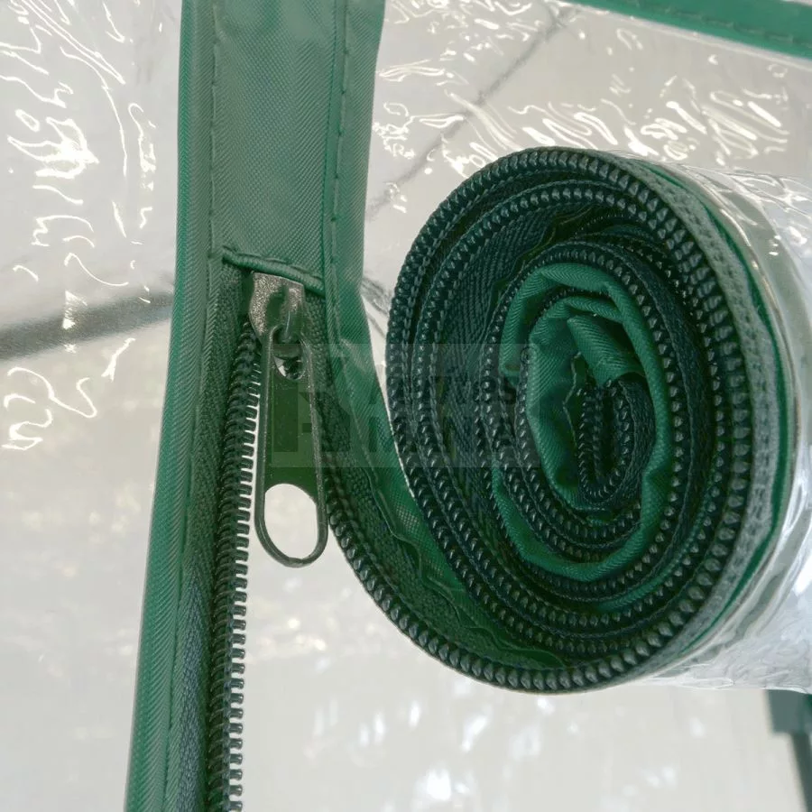 Zöldre festett acél váz, átlátszó borítás dupla cipzárral a könnyű hozzáférhetőségért, 3 polccal. Praktikusan használható teraszokon, erkélyeken. Mérete: 1,25 m x 0,5 m x 0,7 m.