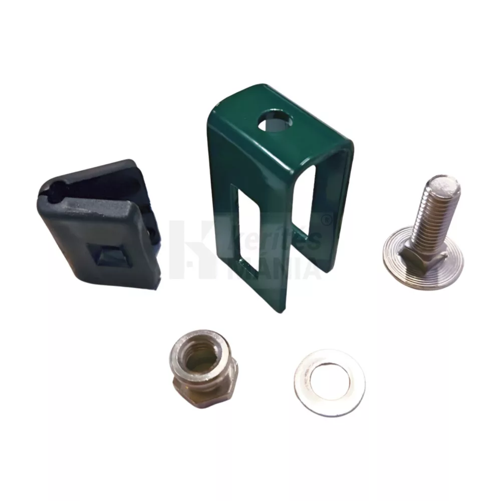 Zöld színű falra szerelhető táblarögzítő 3D és 2D kerítéstáblákhoz. Falba fúrható U‑patent bilincs, amely biztos rögzítést ad falra, betonra vagy fémre. Minden táblás kerítésrendszerrel kompatibilis.