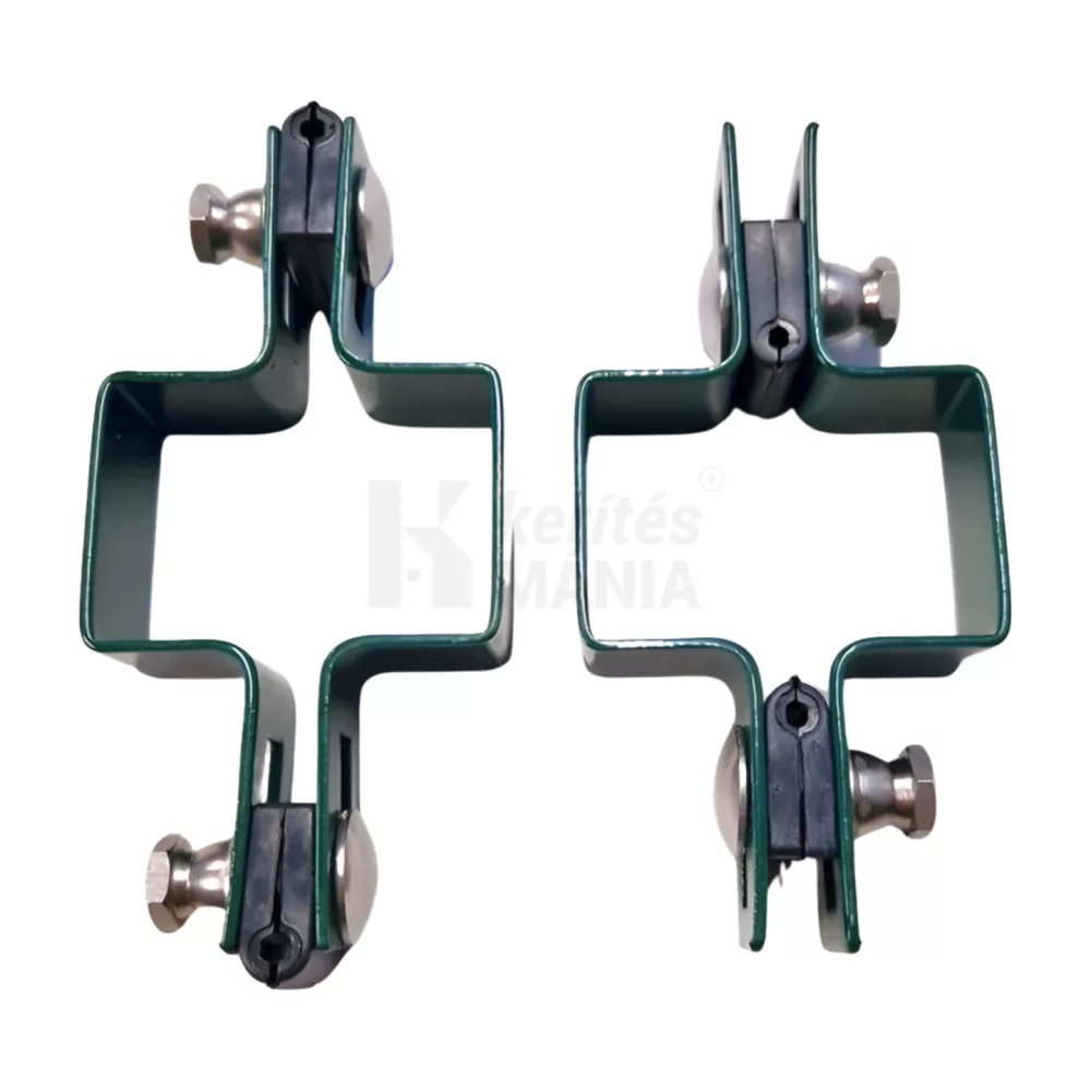 Zöld lemezes átölelő kerítés bilincs 60x40 mm-es Alfa, Galaxia és Mars oszlopokhoz. Műanyag betétes köztes bilincs ömetszős anyával. Horganyzott és festett lemezes bilincs a biztonságos táblarögzítésért.