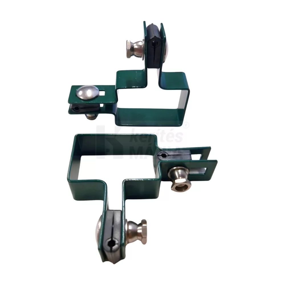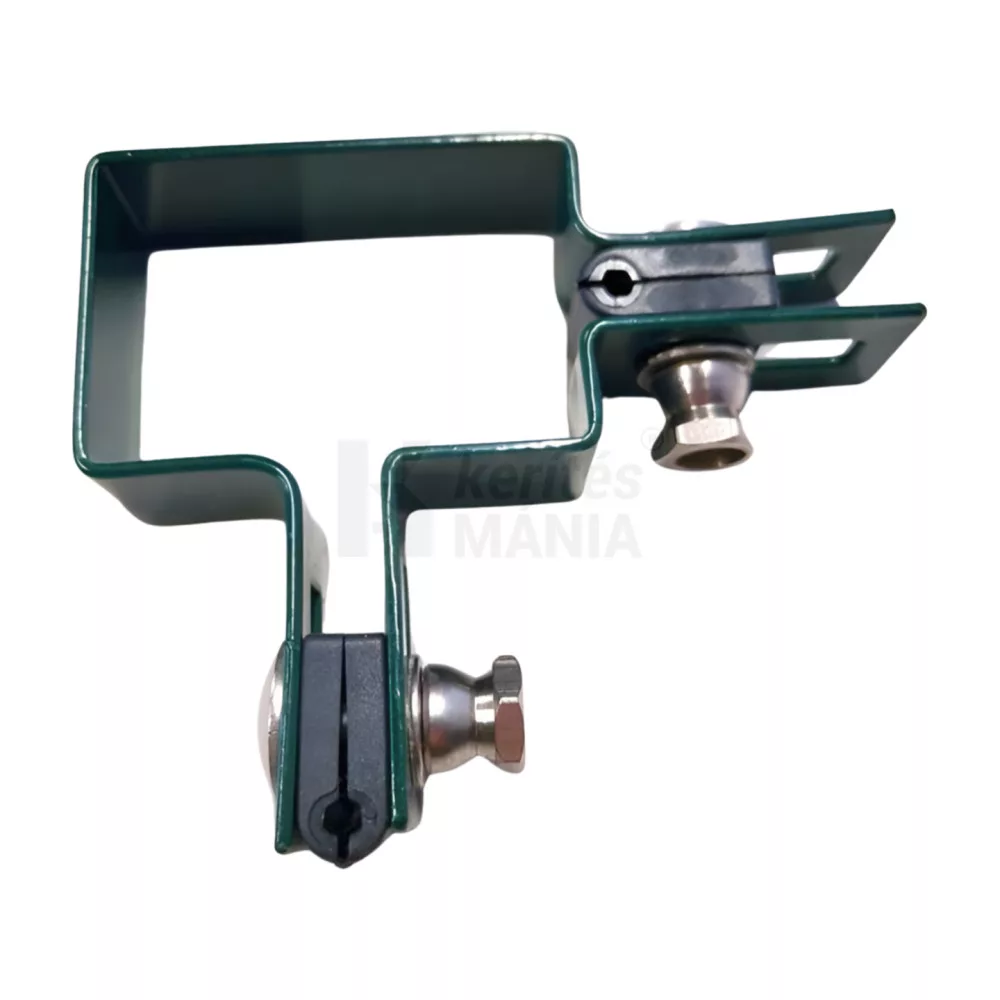 3D és 2D kerítés tábla rögzítő, átöllő lemezes fordító elem 60x40 mm-es zártszelvény oszlophoz zöld színben. Bármilyen szögben lehetővé teszi a szakszerű elfordulást.